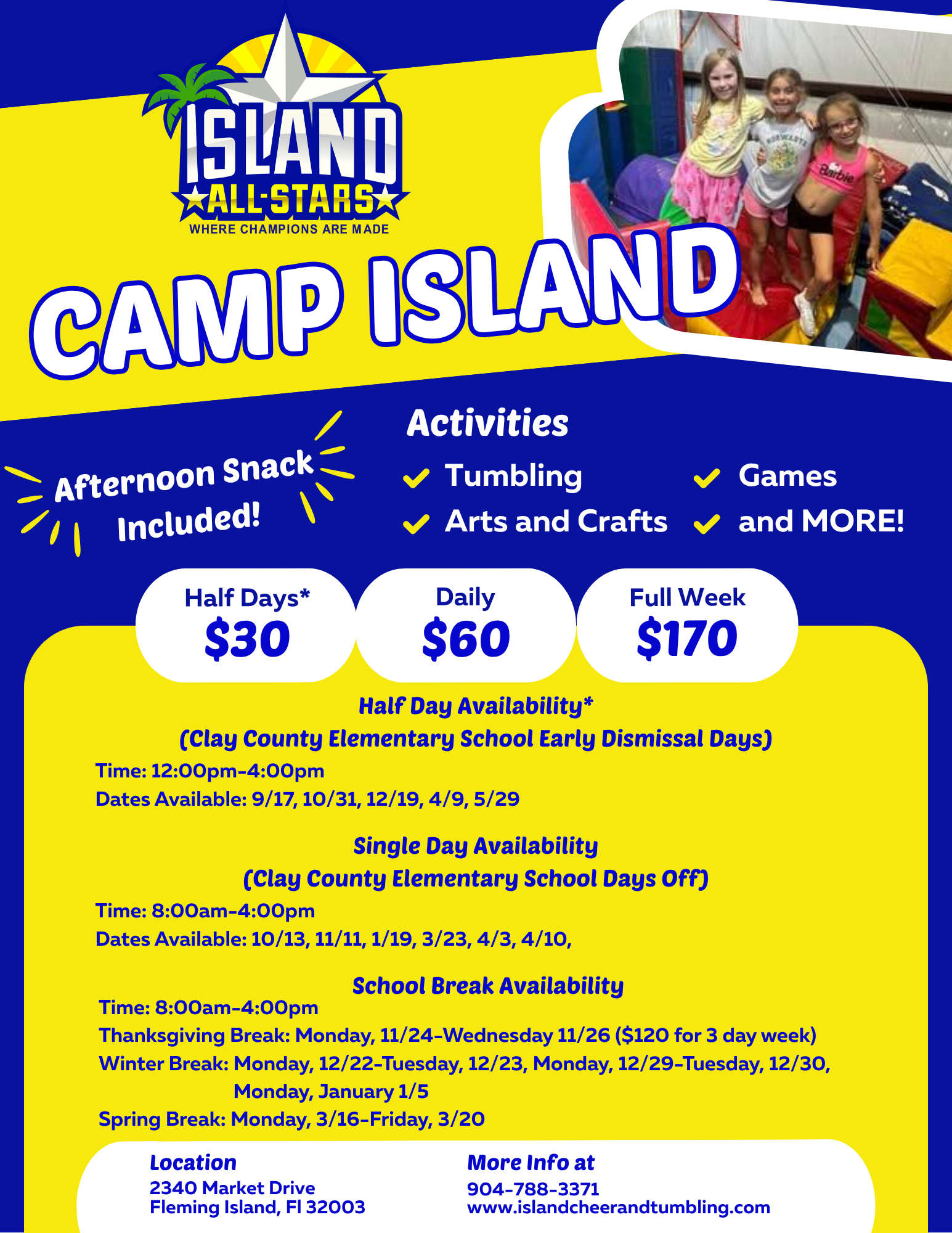 When school takes a break, the fun is just getting started at Camp Island! We’re offering full-day camps on most Clay County school closure days and special programs for elementary early dismissals—so you never have to scramble for last-minute childcare.